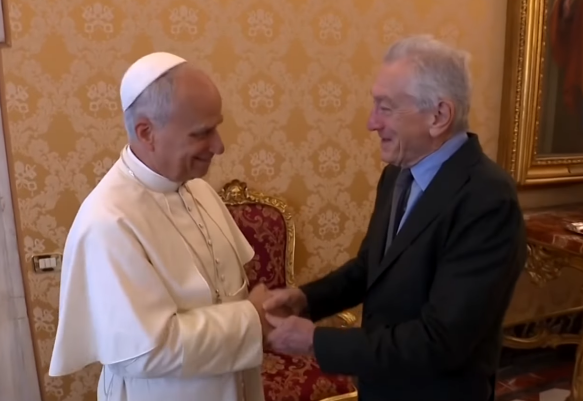 So, the 82-year-old actor, famous for both his legendary performances and his legendary meltdowns, was in Rome for forty-eight hours. He received the Lupa Capitolina — Rome’s highest honor — and, naturally, capped it off with a Vatican visit to Pope Leo XIV. The Pope, ever the gentleman, greeted him warmly, exchanged gifts, and even gave him a rosary. I’m sure it’ll look nice next to De Niro’s collection of anti-Trump soundbites.